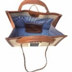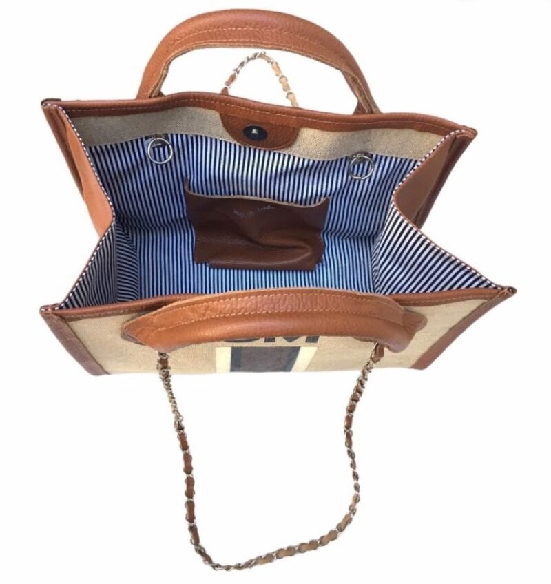 Interior forrado en lona rayada y cierre con imán. Bolsillo con cierre y  porta celular de cuero.