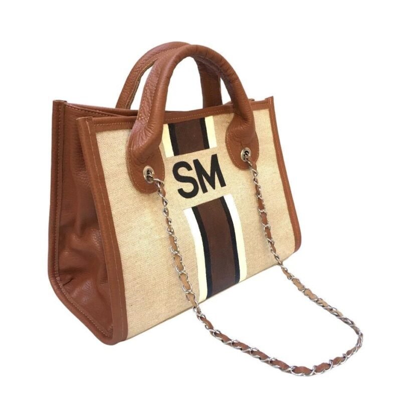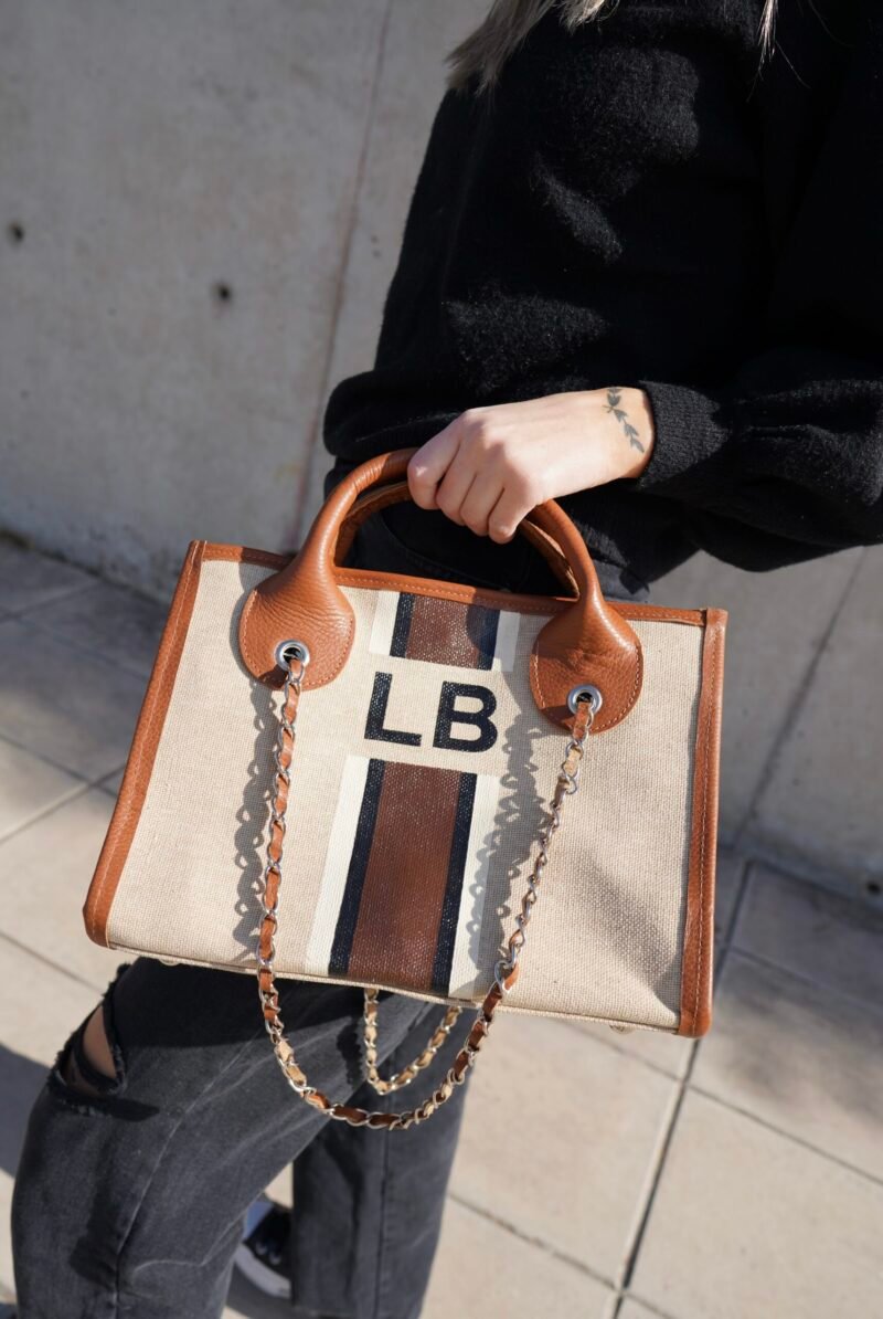 Bolso de lona bondeada color arena con detalles en cuero color suela.