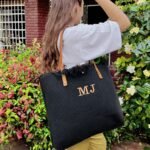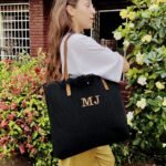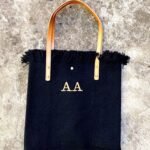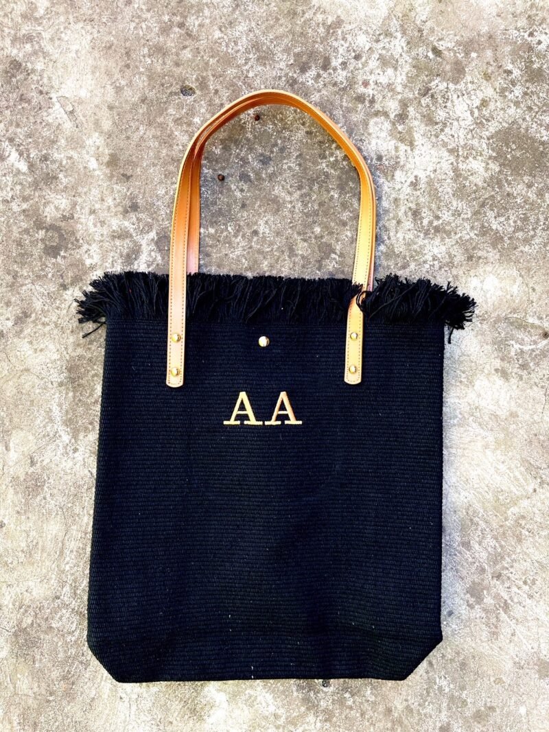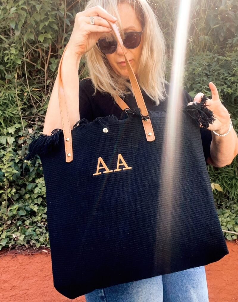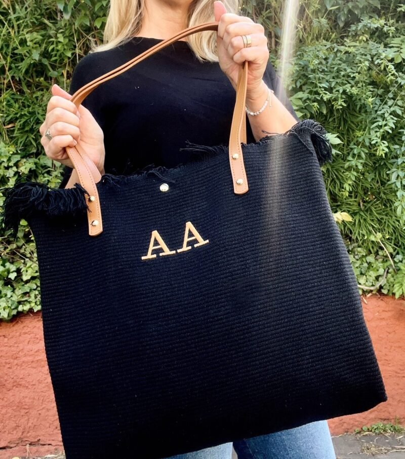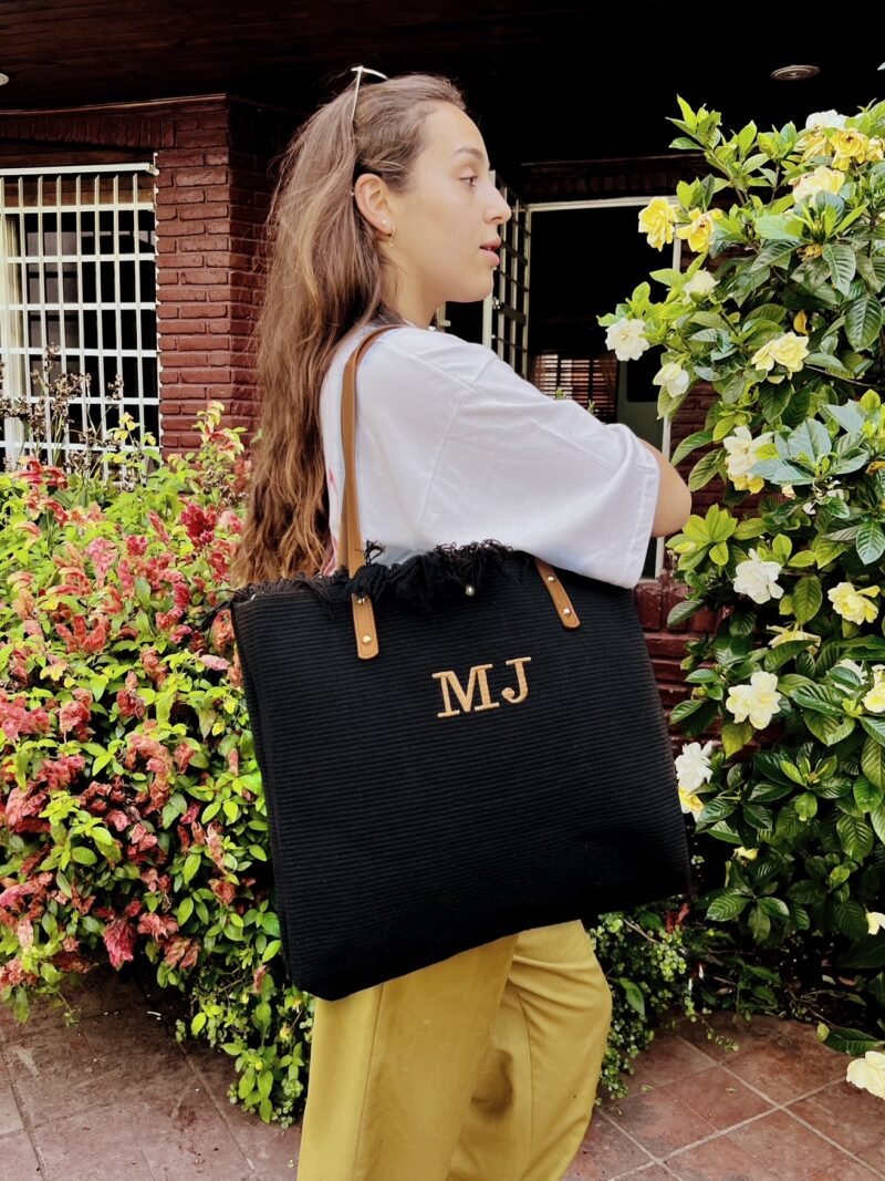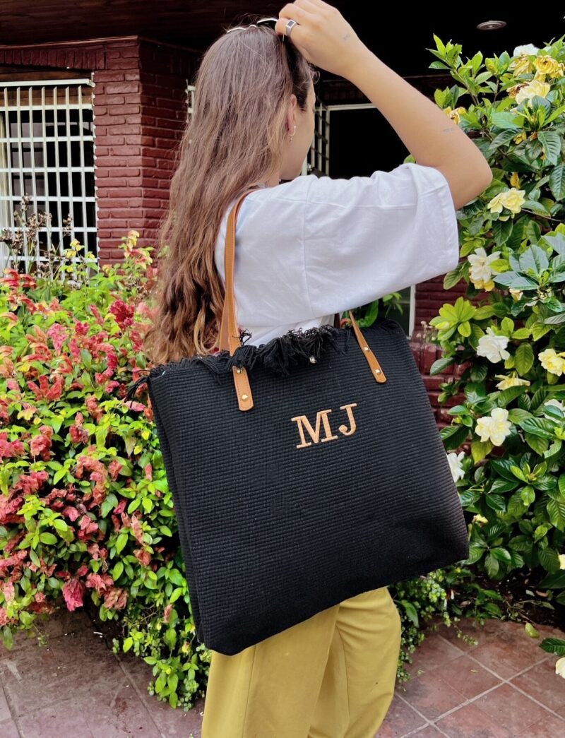 Bolso de algodon con trama y flecos color negro. Correas de cuero ecologico color suela.