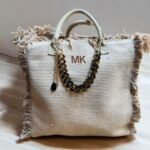 Bolso de algodón forrado con flecos. Apertura con cierre y bolsillo interno. Correas cortas y largas e iniciales bordadas.