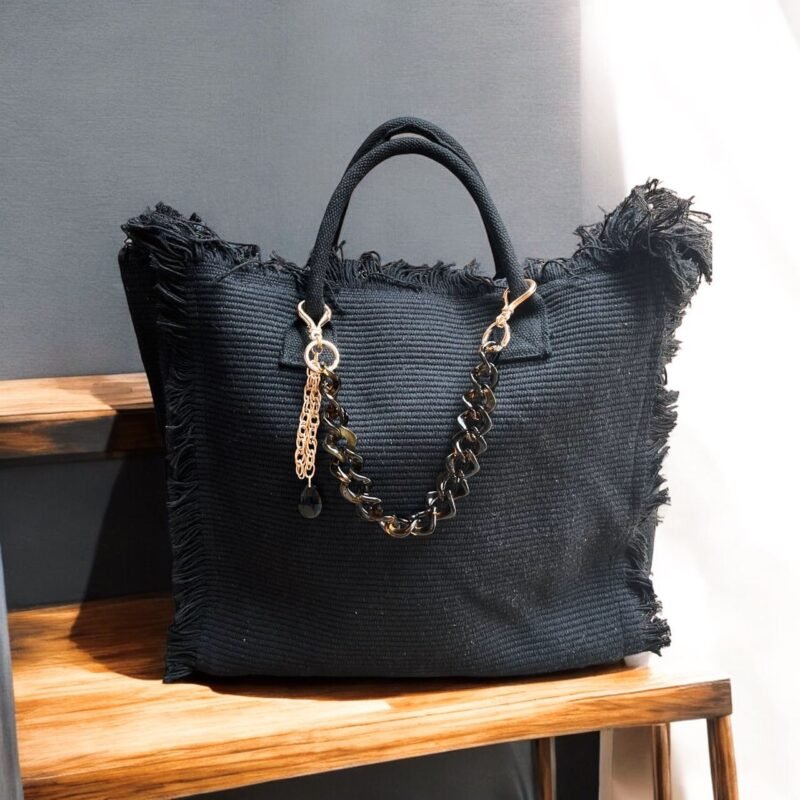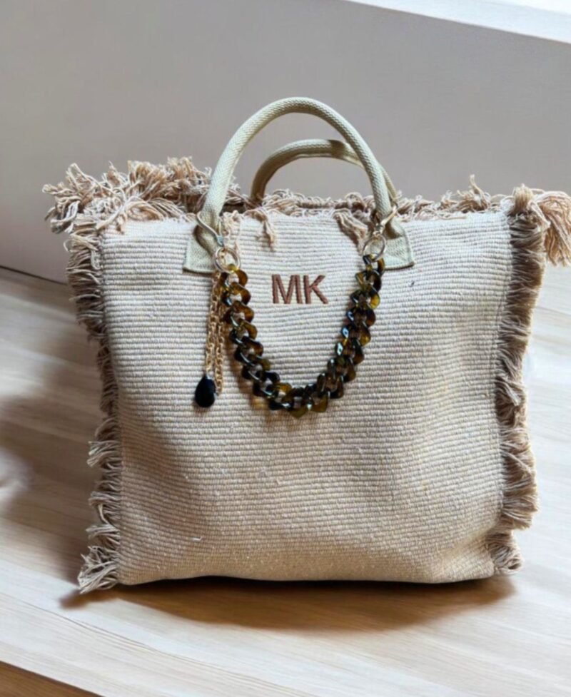 Bolso de algodón forrado con flecos. Apertura con cierre y bolsillo interno. Correas cortas y largas e iniciales bordadas.
