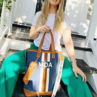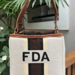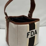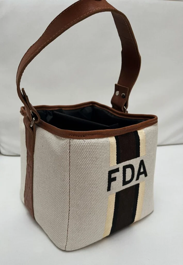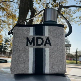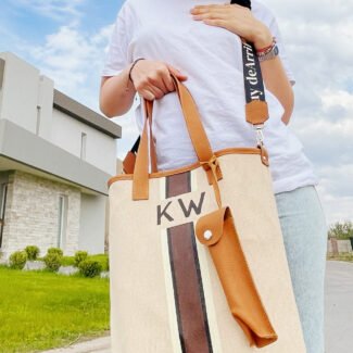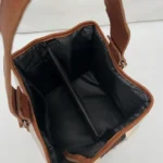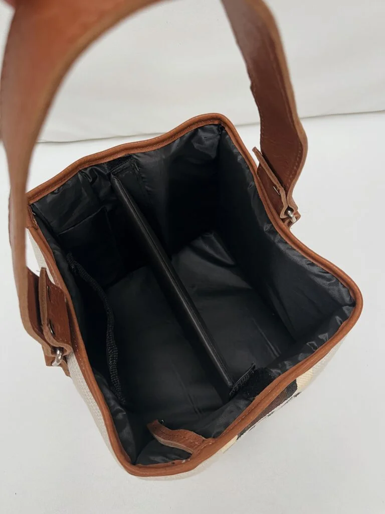 Interior forrado con tela silver de fácil limpieza. Base, manija y detalles en cuero.