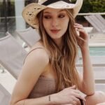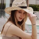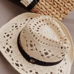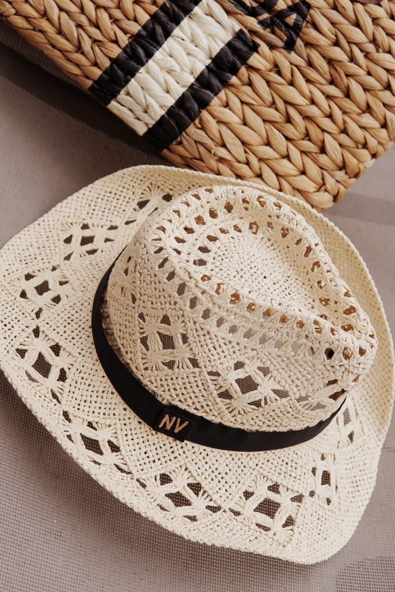Sombrero cowboy de rafia rigida calada con cinta de caracoles personalizada con iniciales.